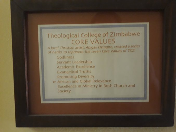 The principal, Dr Raymond Motsi is a wonderful and inspiring man. He speaks to us about the development of the college and the vision they have for it. Dr Motsi is honest, the college has had its challenges, a few years ago it was unable to deliver any courses as the university they were affiliated to did not register them. However, he spoke of how this led to the college realising they were strong in theology and academic rigor but that they were lacking a business plan. Despite the economic difficulties in the country the college now has a plan for development, there is building work underway, they are ensuring that they are not reliant on one income stream, not reliant upon donations but have income through letting their accommodation and other options for self funding and sustainability. The whole atmosphere and ethos was positive, looking towards the future and planning to grow and equip students to lead and resource the church (whatever denomination that might be).